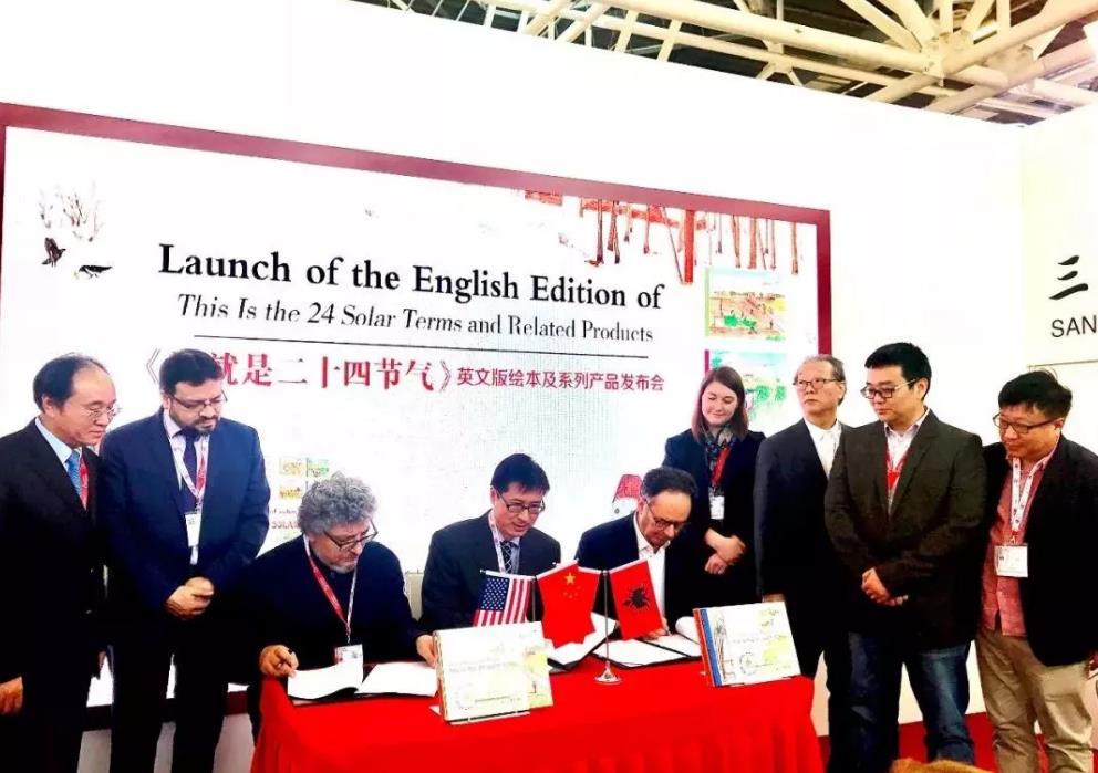 來自國內外的多家文化出版機構應邀出席活動,海豚出版社與阿爾巴尼亞知識出版社、美國天馬出版社現場簽署了《這就是二十四節氣》阿爾巴尼亞文版、英文版版權協議,并與德國布拉克洛出版社、尼泊爾現時出版社達成《這就是二十四節氣》海外版權合作意向。