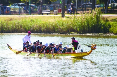 在以色列特拉維夫的亞爾昆河,龍舟隊在比賽中向終點進發。圖為新華社發