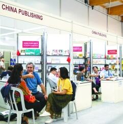 在第28屆耶路撒冷國際書展上,一名書商(左二)與中國參展單位洽談。圖為新華社發