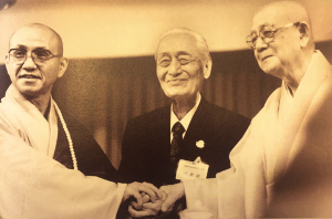 1995年5月,首屆中朝日佛教友好交流會議在北京舉辦。圖為中國代表團團長趙樸初居士(中)與韓國代表團團長宋月珠長老(右)、日本代表團名譽團長中村康隆長老(左)握手。
