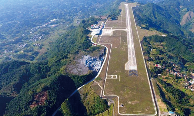 近2000個日日夜夜,那些高昂的山頭被削平了。大大小小的山頭被削掉了65座。航站樓、停機坪、住宿樓,一一建成,占據著方圓幾十畝地。高空俯視,像一只蝴蝶一樣翩翩而飛的候機樓,筆直平坦的跑道,綠油油的草坪,那樣錯落有致。四周的防護欄也豎起來了。建設者們甚至把桂花種到了懸崖邊上。