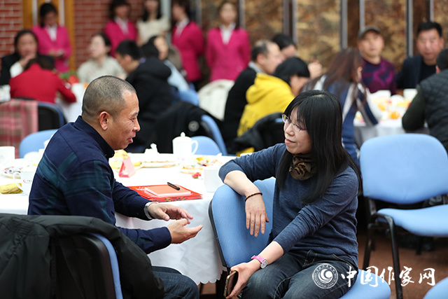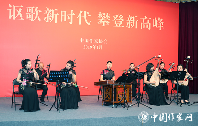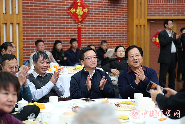在喜慶歡快的樂曲聲中,與會作家們親切握手,熱情交談,合影留念,互致新春祝福,回顧過去一年文學事業繁榮發展取得的成就,展望新一年中國文學的美好未來。部分中國作協會員、青年干部職工和藝術家們表演了精彩的文藝節目。
