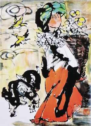 畫面上,三三兩兩的少數(shù)民族姑娘在悠閑地玩耍,身邊圍繞著水牛、山羊和兔子。姑娘們頭上隨意插著大山里的野花野草,密林深處那些不知名的鳥兒、色彩斑斕的蝴蝶、大大小小的野蜂或站在她們的肩膀上,或飛在空中……畫作中大寫意的技法、老到的筆觸、大膽的用色、夸張的舞姿、天馬行空的構(gòu)圖,充滿視覺沖擊力。尤其是那些以山花野草為霓裳,以山羊、野禽為伙伴的大山姑娘,個個沒畫眼睛,即便是一筆掠過,也頂多勉強(qiáng)算是閉著眼睛。