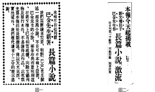 在新文學影響持續發酵的1930年代,《時報》此舉一方面體現了其“報界先鋒”的地位,大舉革新,刊載新文學小說。另一方面,《時報》連載剛剛走向成熟的新文學長篇小說,很明顯是含有借新文學作家名聲擴大報紙影響力,進而提高報紙銷量的用意。《激流》預告中稱巴金為“新文壇巨子”,作品不易讀到。巴金卻否定道:“這明明是吹牛。我當時只出版了兩本中篇小說,發表過十幾個短篇。文學是什么,我也講不出來,究竟有沒有進入文壇,我自己也說不清楚,哪里來的‘巨子’?”[32]