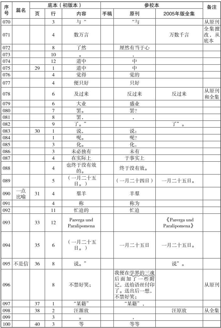 在決定專心從事此項匯校工作之后,因為用于匯校的底本(影印本)、手稿(影印本)與全集筆者早已收藏,因此在資料方面只余下原刊的搜求匯集。得益于近年來舊書刊被大規模掃描和收入網絡數據庫的利好以及學友的幫助,這項工作在短短幾天內即基本完成。[vii]接下來在進行具體匯校時,為了讓自己沉下心來,全神貫注,我決定先不參考任何前賢成果,空無依傍,對文本進行“素讀”,以保證能最大限度地發現各版的差異之處。由于手稿嚴重不全,全集差錯很少,因此我把重點放在原刊和初版本的對勘上,逐字逐句進行。在對勘過程中發現兩者有任何差異,無論是文字還是標點,都及時記錄并填入匯校表中。將原刊和初版本對勘完成后,再按同樣的程序,將初版本和全集進行對勘。此后,再將手稿和初版本進行對勘。當然,這只是工作的一般程序。實際過程中,遇有疑難處,需要各版互校,也常出現將所有版本擺滿案頭的情形。