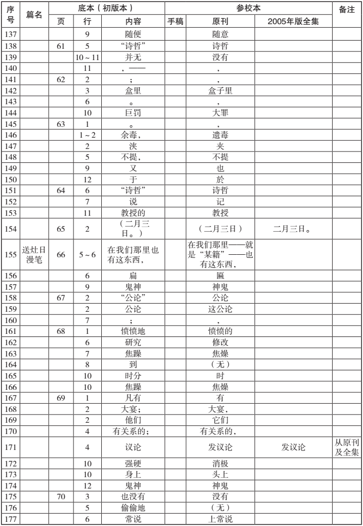 如此就完成了第一遍匯校工作。第二遍則參考現有校勘成果,查漏補缺。重點是對照孫用先生《魯迅全集校讀記》(1982年版)中的《〈華蓋集續編〉校讀記》,以及自2005年版《魯迅全集》出版以來學界公開發表的校勘成果中所有與《華蓋集續編》有關的部分,對相關文本進行復核,確認個人失校的案例,將其補充進匯校表,以使工作相對完善。