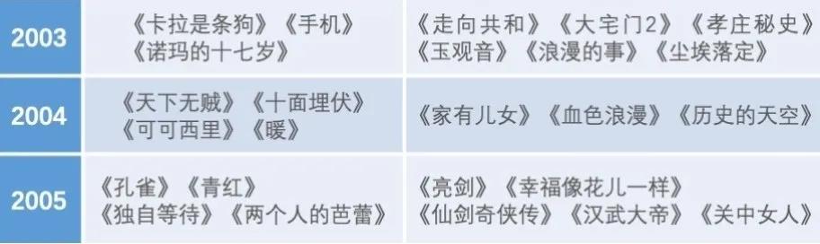 在明確中國現(xiàn)代Ⅱ第二波具有流動回溯的現(xiàn)代性這一特質以及影視藝術在人生情境體驗營造上的美學特長的交叉點上,可以更清晰地觀察21世紀初中國影視潮的狀況。從下列表格的簡要列舉,可以對這二十年中國影視潮中的部分作品作一次匆匆瀏覽: