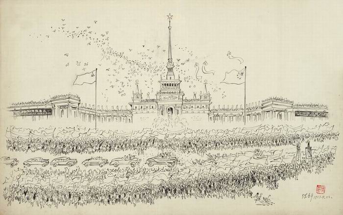 我后來想想也是,他最早畫三毛并不是很講究人體解剖,但是在《三毛從軍記》《三毛流浪記》能夠看出來他是很講究人體解剖和透視,有從西洋畫吸取內容,而且線條也很講究。在解放后,《南京路上新風光》等一些建筑大場景圖,就有采用中國畫傳統散點透視的方法,還畫了一些云層表達樓層高、虛無縹緲之感,與中國山水畫的方法是類似的。我記得小時候父親的桌上總是放了好多參考書,其中印象最深的是一本外國人的《藝用人體結構》,還有一卷《八十七神仙圖卷》。他有時候會臨摹一些中國畫,他出門時,他身上總是帶著速寫本的。