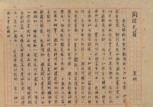 41篇文稿有的用深綠色和淡綠色稿紙,有的用紅色普通格子紙或榮寶齋稿紙書寫,字跡工整美觀,鮮有修改痕跡,周作人本人的說明不多,編輯的加工和批注更少。這些手稿據(jù)考證,為周作人在1960年至1965年之間投稿給香港《新晚報》的手稿,為《新晚報》創(chuàng)始人羅孚多年間的珍藏。