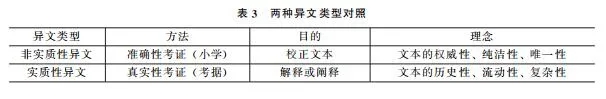 通過(guò)《景德傳燈錄》的具體例證可以看出:在文本的對(duì)校中會(huì)出現(xiàn)兩種異文,“實(shí)質(zhì)性異文”和“非實(shí)質(zhì)性異文”。此兩類異文普遍存在于校勘實(shí)踐中,但對(duì)兩類異文的處理與關(guān)注,中西方存在著比較大的差異。我國(guó)由于進(jìn)入印刷時(shí)代較早,保存的抄本、寫(xiě)本相對(duì)較少,所以異文中“非實(shí)質(zhì)性異文”所占比重較大,而在處理“非實(shí)質(zhì)性異文”方面積累了豐富的經(jīng)驗(yàn)與技術(shù),借助于文字學(xué)、音韻學(xué)、訓(xùn)詁學(xué)等小學(xué)的知識(shí),大量的“非實(shí)質(zhì)性異文”可以得到解決。然而,由于印本時(shí)代典籍的整齊化過(guò)程,大量的“實(shí)質(zhì)性異文”已被消除,多數(shù)典籍文本趨于整齊,可以說(shuō)很長(zhǎng)的時(shí)間內(nèi),“實(shí)質(zhì)性異文”并沒(méi)有受到傳統(tǒng)校勘學(xué)的足夠關(guān)注。20世紀(jì)以來(lái),簡(jiǎn)牘、帛書(shū)、敦煌文書(shū)、黑水城文獻(xiàn)、日本古抄本等文獻(xiàn)的陸續(xù)發(fā)現(xiàn),使我們得以重見(jiàn)抄本時(shí)代的典籍文獻(xiàn),也使我們知道,典籍整齊化之前存在著大量的“實(shí)質(zhì)性異文”。而這些“實(shí)質(zhì)性異文”既不能從典籍內(nèi)部通過(guò)小學(xué)的方法得以解決,也無(wú)法全部抉擇出最佳文本,定于一尊。只有將文化環(huán)境、意識(shí)形態(tài)、權(quán)力機(jī)制考慮進(jìn)去,才能解釋這些異文產(chǎn)生的機(jī)制,對(duì)這些異文進(jìn)行合理的闡釋。也就是說(shuō),對(duì)于“非實(shí)質(zhì)性異文”可以運(yùn)用文字、音韻、訓(xùn)詁等小學(xué)的方法,通過(guò)“準(zhǔn)確性”考證,最終校正錯(cuò)謬,整理出一個(gè)“正確”的文本。而對(duì)于“實(shí)質(zhì)性異文”,則需要綜合運(yùn)用考據(jù)學(xué)的方法,進(jìn)行“真實(shí)性”考證,對(duì)異文產(chǎn)生的文化環(huán)境、意識(shí)形態(tài)及權(quán)力機(jī)制進(jìn)行分析,弄清異文產(chǎn)生的機(jī)制。對(duì)于此類異文,或許最終無(wú)法決定異文的正誤,進(jìn)言之,這些異文本身其實(shí)并無(wú)“正誤”之分,而只是不同知識(shí)譜系中的形成物。對(duì)于“非實(shí)質(zhì)性異文”,可以通過(guò)校正錯(cuò)誤得到正解;而對(duì)于“實(shí)質(zhì)性異文”,只能通過(guò)對(duì)比作出解釋。“非實(shí)質(zhì)性異文”的處理實(shí)際上是對(duì)文本權(quán)威性、純潔性、唯一性的追求;“實(shí)質(zhì)性異文”的處理則是對(duì)文本歷史性、流動(dòng)性、復(fù)雜性作出的分析與描述(見(jiàn)表3)。而要發(fā)現(xiàn)、解決文本歷史性、復(fù)雜性的問(wèn)題,則需借助于文本的考古。