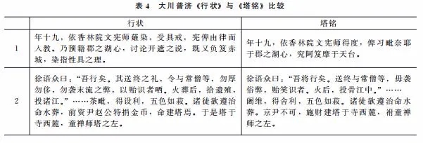 首先來(lái)看,從行狀到塔銘普濟(jì)的生平信息發(fā)生了哪些變化?通過(guò)對(duì)比發(fā)現(xiàn),除了文本形式(如行狀只敘不銘,而塔銘則有敘有銘)、語(yǔ)言表達(dá)不同之外,有些史實(shí)也發(fā)生了變化(見(jiàn)表4)。