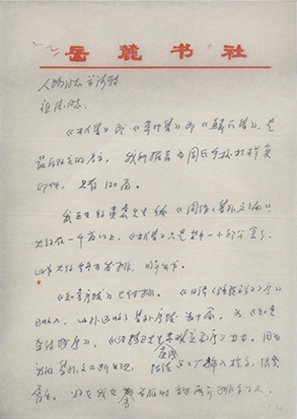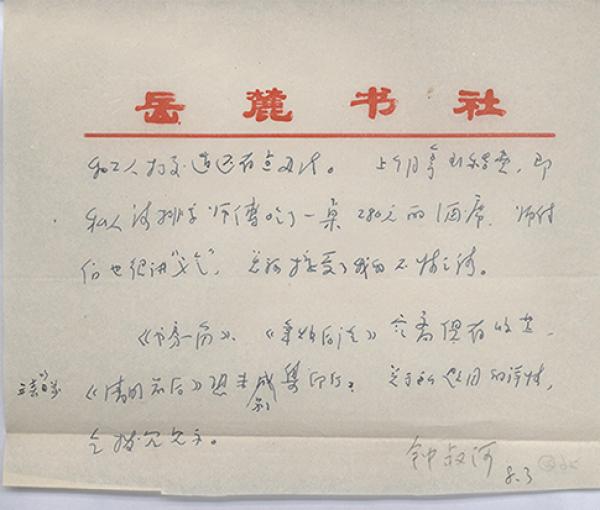 此札雖短,但歷史的信息頗為豐富。信的開頭先解釋了《木片集》書名的出處,繼而相告正在約黃裳編《周作人集外文編》。信中雖明示發(fā)排和出書的大致時間,但最終黃裳并未應承此事,而是改由陳子善完成了這個選題,即1988年岳麓書社出版的《知堂集外文·〈亦報〉隨筆》和《知堂集外文·四九以后》。接著又告知《知堂序跋》的付排及其相關(guān)內(nèi)容,最有意思的當屬“私人請排字師傅吃了一桌二百八十元的酒席”,師傅們于是很講“義氣”,總算接受了鍾叔河陸續(xù)將新發(fā)現(xiàn)的集外佚文插入排字的不情之請。此外,從此信的上款推測,谷林或許就是經(jīng)由秦人路的介紹才與鍾叔河開始通信的吧。