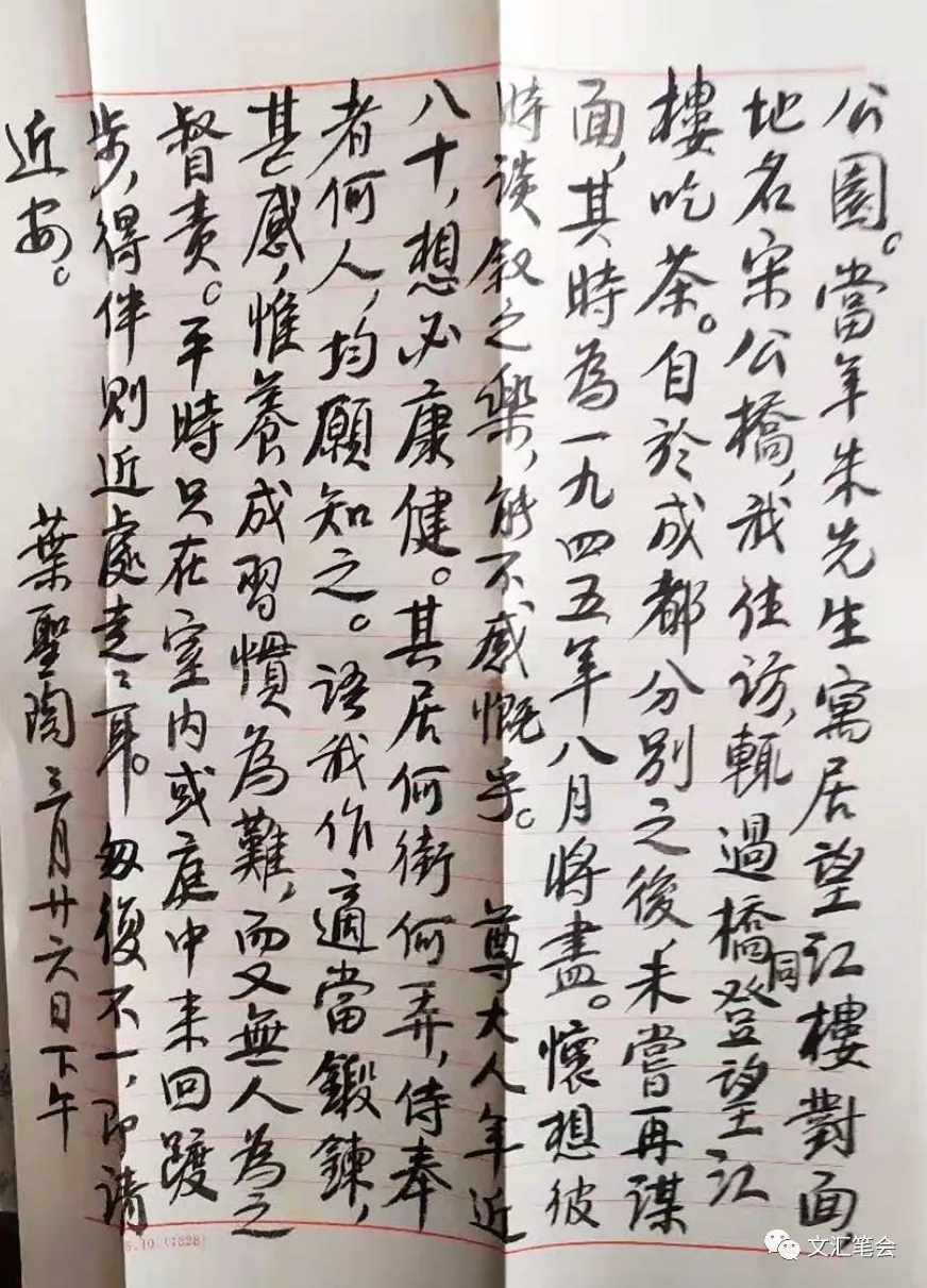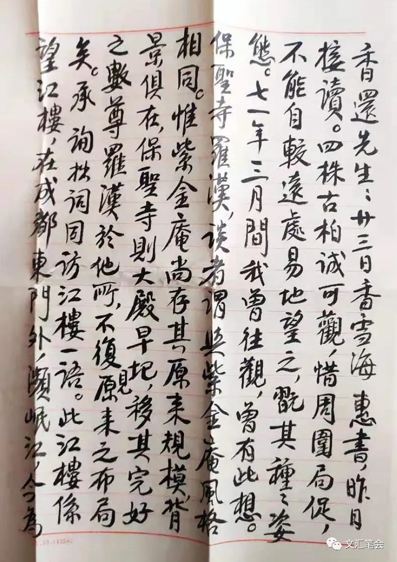 香還先生:廿三日香雪海惠書,昨日接讀。四株古柏可觀,惜周圍局促,不能自較遠處易地望之,玩其種種姿態。七一年三月間我曾往觀,曾有此想。保圣寺羅漢,讀者謂與紫金庵風格相同。唯紫金庵尚存其原來規模,背景俱在,保圣寺則大殿早圮,移其完好之數尊羅漢于他所,不復見原來之布局矣。承詢拙詞同訪江樓一語。此江樓系望江樓,在成都東門外,瀕岷江,今為公園。當年朱先生寓居望江樓對面,地名宋公橋,我往訪,輒過橋同登望江樓吃菜,自于成都分別之后,未嘗再謀面,其時為一九四五年八月將盡。懷想彼時談敘之樂,能不感慨乎。尊大人年近八十,想必康健。其居何街何弄,侍奉者何人,均愿知之。語我作適當鍛煉,甚感,唯養成習慣為難,而又無人為之督責。平時只在室內或庭中來回踱步,得伴則近處走走耳。匆復不一,即請