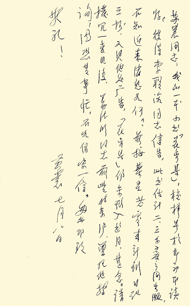 最近還是忙,也不知忙些什么,過兩天想寫一篇《魯迅與浙江》,給曾定夷同志,上海作協(xié)要開會了。月前姜德明兄來滬,曾數(shù)次晤談,也談及您,對您的眼光、氣魄都極贊嘆。盼你們的出版社做出好成績來。匆此即致敬禮!
