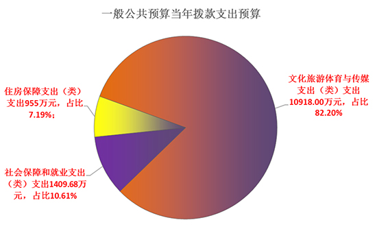 文化旅游體育與傳媒支出(類)支出10918.00萬元,占比82.20%;社會保障和就業支出(類)支出1409.68萬元,占比10.61%;住房保障支出(類)支出955.00萬元,占比7.19%。