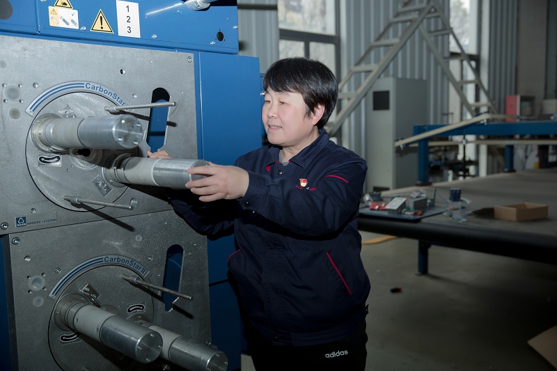 4月29日,這天上午,于素梅早早就來到了廠里,整理和打印為中復神鷹碳纖維公司高端碳纖維生產線設計的部分紡絲設備圖紙。她跟我說過:她對圖紙有感情。這我理解——1987年,大學剛畢業的于素梅被分配到連云港紡織機械廠(連云港鷹游紡機集團有限公司前身)技術科工作,從此她就立足技術崗位,扎根生產一線。在具體工作中,她以一個年輕技術員的身份,完成了燙剪聯合機、水洗機、磁棒印花機等10余種新產品的設計的主創研發。那時候,她干得最多的工作,就是畫圖。2005年公司重組后,于素梅從紡織設備的開發投身于碳纖維裝備與技術研發工作。當時,碳纖維屬于高性能纖維,在國外都屬于技術保密項目,而外國公司為了獲取更大的利益,只愿意高價出售產品,而不出售設備與技術。為打破國外碳纖維技術封鎖,董事長張國良稟持“為祖國爭光、為民族爭氣”的堅強信念,抽調于素梅等技術骨干專門攻克高性能碳纖維產業化難題。接下來,在兩個多月時間里,于素梅所在團隊畫了近萬張設計圖紙,不斷解決遇到的各種難題,終于打通了聚合、紡絲、碳化全部工藝流程,完成了年產500噸原絲生產線和年產100噸碳化生產線全部裝備的研制工作,形成了百噸級碳纖維的成套生產線,并于2007年5月首次連續生產出合格的碳纖維。正是在此基礎上,于素梅與同事們相繼完成多條碳纖維生產線,以及碳纖維預浸布的復合材料預浸設備生產線的設備的設計開發工作,實現了T300/ T700/T800級碳纖維及原絲設備的全部國產化、規模化生產。她和同事們研發的“干噴濕紡千噸級高強/百噸級中模碳纖維產業化關鍵技術及應用”項目獲得2017年度國家科技進步一等獎。今天,她要根據圖紙指導工藝人員明確其中的關鍵零部件,以提醒其在編寫加工工藝時的注意事項。考慮到進口軸承供貨周期長,她又安排提前為采購人員提供設備中選用的進口軸承型號及數量明細表,方便其與供應商交流,避免因軸承交貨不及時影響設備裝配從而影響整個生產線的交付時間。就這樣說說做做,一個上午過去了。到了下午,她又開始了編寫中復神鷹公司購置的4米碳化線部分設備使用說明書工作。