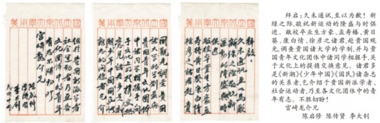 滔天長子宮崎龍介(1892—1971)畢業(yè)于東京帝國大學(xué)法學(xué)部,理解中國“五四”運(yùn)動(dòng),與陳獨(dú)秀、李大釗有親密交往。龍介對(duì)日本的侵略政策一貫持批判態(tài)度,第二次世界大戰(zhàn)后為和平運(yùn)動(dòng)及日中友好運(yùn)動(dòng)做出了許多貢獻(xiàn)。在書中收錄的兩封李大釗在1919年10月寫給龍介的兩封親筆信中可知,那時(shí)五四運(yùn)動(dòng)剛剛過去五個(gè)月,李大釗曾多次邀請(qǐng)同在北京的龍介詳談,一次是去自己住處,一次是往假座香場六味齋。李大釗用毛筆或鋼筆寫信,所用紅線信紙上方一行印有“國立北京大學(xué)用箋”八字。在另一封李大釗聯(lián)名陳啟修、陳傳賢在1920年春寫給宮崎龍介的信中,李大釗向?qū)m崎龍介介紹北京大學(xué)的幾位學(xué)生去日本調(diào)研,希望龍介能介紹日本的革命青年和進(jìn)步學(xué)者相識(shí),在信中李大釗飽含熱情地祝愿并與之分享“新運(yùn)動(dòng)的隆盛”。時(shí)隔不久,陳獨(dú)秀也給宮崎龍介寫信,希望已經(jīng)回到日本的他可以幫忙介紹照顧友人,信中陳獨(dú)秀提到去年(1919年)在北京兩人曾相談甚歡。