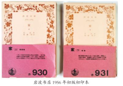 飯塚朗系日本著名漢學家,也是巴金的鐵桿粉絲,著有《島崎藤村、巴金、布爾熱的〈家〉的浪漫主義》《小論巴金——向環境挑戰》等論文。二戰結束后,飯塚朗傾心打造出《家》的新譯本。這種日譯本有兩種版本,分別由東京鐮倉書庫和巖波書店印行。鐮倉書庫版本系依據開明書店的民國后期版本翻譯而來,被列為“世界文學選叢書”第一種,印刷于1948年7月25日,發行于同年8月1日,系32開精裝本,正文328頁,另附《解說》和《家系圖》,封面為綠白兩色,下半部橫亙著一座歐洲城堡,與小說內容格格不入。這種70余年前誕生的老版本在“孔網”僅現身一次,被我幸運地以超低價拍得。至于巖波書店版本,乃是分訂上下兩冊的64開本。與青年書房的兩卷本不同,巖波書店的初版本上下兩冊都有版權頁,分別貼有版權票,出版時間有先后,各有訂價,可分開銷售。其上冊初版初印于昭和三十一年即1956年10月5日,正文311頁,另附《高家系圖》,訂價120日元;下冊初版初印于同年11月26日,正文196頁,另附《解說》和“巖波文庫”所收錄書籍的發行廣告,訂價80日元。這種口袋書售價低廉,便于攜帶,受到市場青睞,一再加印,我有幸見過1963年11月的四印本和1985年9月的五印本;另有一種2019年2月印行的九印本也有網上銷售記錄,系壓膜本,有書衣。我收藏的該書系初版初印本,品相完好,攜帶有《索引》中未見的粉紅色書衣,系網上孤品。書衣上的文字顯示,其上冊為“巖波文庫”赤930種,下冊為赤931種。需要說明的是,巖波書店版本與鐮倉書庫版本在文字上存在出入。在新版本出版前,譯者曾委托另一位漢學家岡崎俊夫依據人民文學出版社1953年6月的新版本進行修訂,糾正了一些文字上的硬傷,刪除了一些冗長的字句。飯塚朗在《〈家〉日譯本解說》一文中,披露了翻譯的艱辛過程:“我在翻譯這本書時最成問題的就是稱呼。行輩即前輩后輩的順序要根據講話人的地位而有所不同。小說中雖基本上從覺慧這一代人去稱呼,可是即便是同輩人之間,也要因說話者而異。若是年長的男子,要稱他‘哥’,對年長的女子要稱‘姐’或者‘姊’,對年小的則稱‘弟’‘妹’。所以覺慧自己也有時被稱作‘三哥’,有時被稱作‘三弟”。此外,一稱呼‘老太爺’便含有種對賦閑隱居者的敬意在內,孩子們懷著敬畏之情稱之為‘爺爺’,兒子們要稱呼‘父親’,通俗點兒的叫法是‘爸’或‘爹’,從別的支系上論,外甥或侄子們要叫‘大舅’。這實在煩雜費解,對于日本人來講很不習慣。若是親臨那家族的話,也許能清楚地了解它的輩分關系。在日本沒有伯父、叔父之分,把中國的大家族內的幾叔、幾伯翻譯過來反而沒有真實感,因此我索性使用書中原話。稱排行老三的年輕主人時,叫‘三少爺’,稱最大的小姐為‘大小姐’,稱琴時就叫‘琴表姐’。”