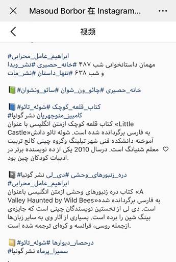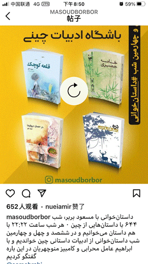 當地時間12月10日晚,伊朗中國文學讀者俱樂部舉辦首場活動,以Instagram 直播間形式發布和分享了一批波斯語版中國文學圖書,包括李迪的《野蜂出沒的山谷》、曹文軒的《草房子》、薛濤的《小城池》和《圍墻里的小柯》等。