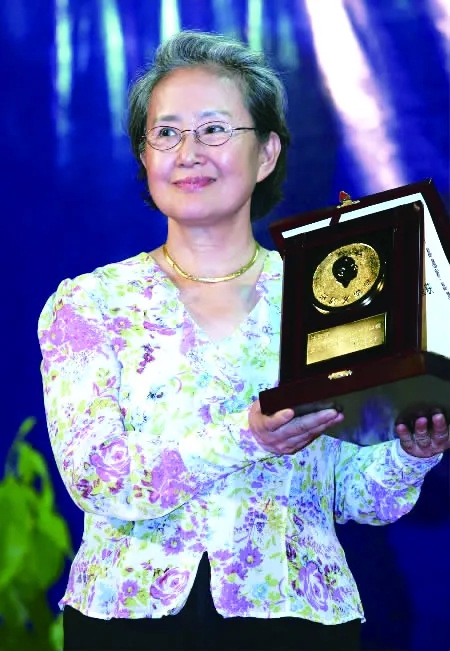 張潔在第六屆茅盾文學(xué)獎(jiǎng)?lì)C獎(jiǎng)典禮。2005年,《無字》獲第六屆茅盾文學(xué)獎(jiǎng)。