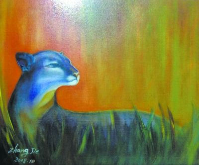 一幀畫于2008年的豹子,我愿意把它叫做雌性的雪豹。畫中雪豹正在回眸,被綢緞般亮麗而又鋒利的闊葉草簇?fù)怼D侨犴g、結(jié)實(shí)的頸部與修長、矯健身軀所構(gòu)成的優(yōu)美曲線,襯著層次豐富的橙黃色眩目背景,使整個(gè)畫面充滿彈性的緊張感。逆光中的雪豹,當(dāng)它的脖頸被一團(tuán)側(cè)光照耀時(shí),作者有意凸顯的這個(gè)局部就煥發(fā)出揉雜著淡紫羅蘭色的高貴。接著你會(huì)被雪豹的眼神吸引:孤傲、警覺,又充溢著濕潤的憂郁,一種不打擾同類亦不打擾人類的自尊。我被這豹子的眼神所打動(dòng),強(qiáng)烈的主觀刻畫剎那間連接了動(dòng)物和人心的溝通。對照那幅“寫意”的側(cè)臉女人,與這雪豹竟有一種靈魂與氣質(zhì)上莫名的神似。在張潔的畫作里,與生俱來一種人與動(dòng)物、動(dòng)物與風(fēng)景之間的平等和信任。在她心中的風(fēng)景里,也說不定動(dòng)物比人更像人。我不能說這幅作品在藝術(shù)上達(dá)到何樣高度,但我可以說,張潔已顯示出她作為一個(gè)藝術(shù)家所必備的銳利眼光、表現(xiàn)能力和叛逆之心。她的畫面常大膽運(yùn)用橙黃、橙紅、桔黃等顏色,亦有大面積綠色入畫,更證實(shí)了她對色彩的自覺訓(xùn)練與胸有成竹的把控。黃和綠是油畫顏料里最容易被“畫臟”的顏色,張潔呈現(xiàn)給觀眾的是熱烈的明澄和清透的豐富。