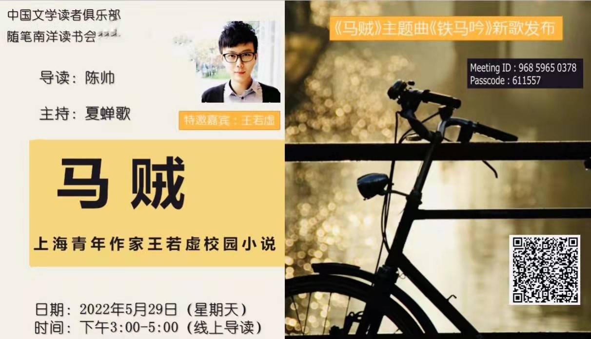 5月29日,新加坡中國文學讀者俱樂部組織導讀中國青年作家王若虛的校園小說《馬賊》,由新加坡作家陳帥主講。活動創新了形式,特別邀請新加坡音樂人以原創主題歌曲的方式參加。活動通過Zoom平臺在線上舉行,并在新加坡國家圖書館的臉書頁面進行了直播。作家王若虛在線與讀者進行了深度交流。