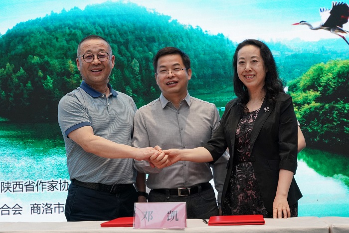授牌儀式上,鄧凱、齊雅麗代表中國(guó)作協(xié)和陜西作協(xié)與商洛市簽訂“新時(shí)代文學(xué)實(shí)踐點(diǎn)”三方合作協(xié)議。鄧凱和賈平凹分別向商洛市頒授了中國(guó)作家和陜西作家“深入生活 扎根人民”新時(shí)代文學(xué)實(shí)踐點(diǎn)牌匾。