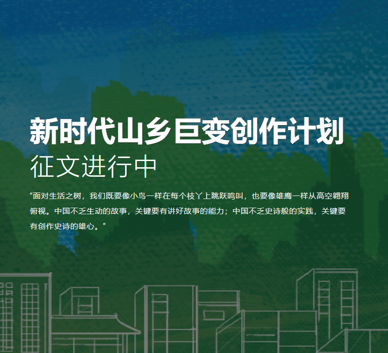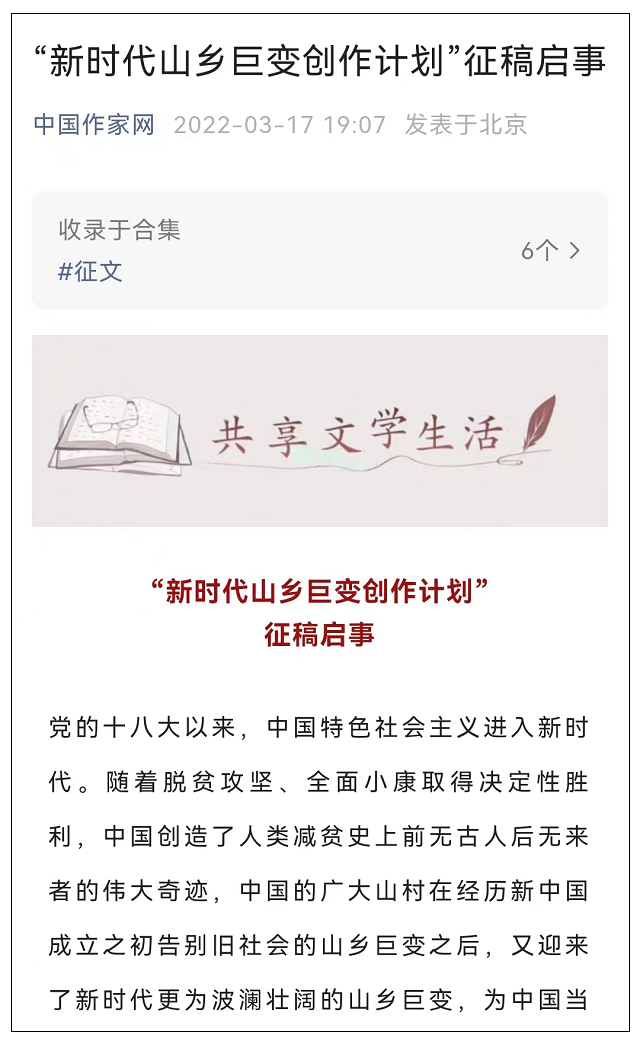 2022年3月17日,中國作家協會正式發布“新時代山鄉巨變創作計劃”征稿啟事。征稿啟事中寫到,“新時代山鄉巨變創作計劃”以原創長篇小說形式聚焦新時代中國山鄉天翻地覆的史詩性變革,多角度展現鄉村時代變遷,生動講述感天動地的山鄉故事,塑造有血有肉的人民典型,為人民捧出帶著晶瑩露珠、散發泥土芳香的新時代文學精品,以文學力量激發新時代鄉村振興的昂揚斗志與堅定信念。
