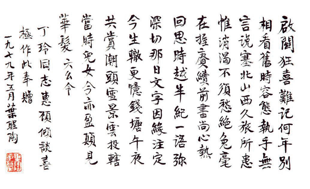 1979年春,丁玲劫后回京,立即去拜訪葉圣陶先生。久別重逢,大家談今敘舊,非常愉快。丁玲夫婦走后,葉圣陶先生思緒萬千,往事歷歷,浮想聯翩,夜不能寐。當天夜里便填寫小令一首,記述丁玲夫婦拜訪傾談的情景。后來,他又將此“喜極之作”,工整地抄錄在宣紙上贈與丁玲。