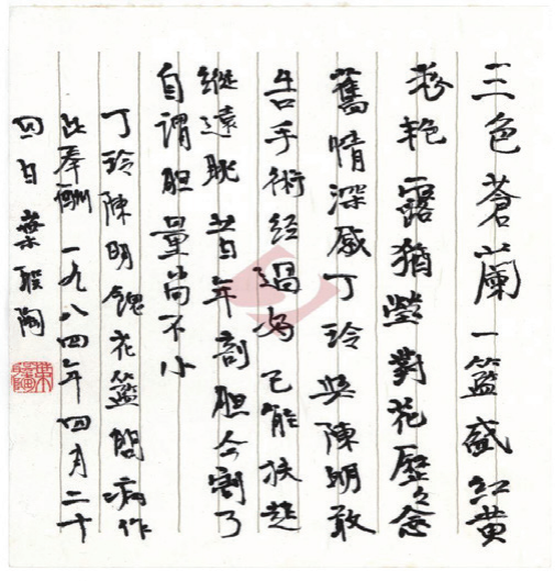 丁玲晚年曾多次去看望葉圣陶先生,無論是先生壽辰還是生病住院,她總要送上誠摯的祝福與問候。1984年3月,年逾九旬的葉圣陶老人因膽結石住院。家人非常擔心,猶豫不決,葉老卻十分樂觀,斷然同意做了膽囊切除手術。丁玲、陳明夫婦得知消息,帶著花籃前往醫院看望。葉老十分感懷,手術后第六天,他便在病榻上寫下《丁玲陳明饋花籃問病作此奉酬》一詩。丁玲在《附記》中說:“此詩作于四月廿三日病榻上,即手術后第六天;四月二十四日手抄寫下?!比~老將這首七言律詩用墨筆抄在16開的豎格紙上,因大病未愈,字跡有些歪歪扭扭,但仍舊清晰整潔。并在款識“葉圣陶”下方鈐“葉圣陶”(朱文)姓名章一方。