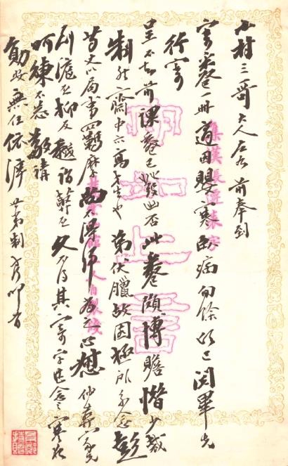 陶氏于光緒五年(1879)四月任湖南學政,其使用的“守如上言”花箋,應是當地文友陳守愚所贈。光緒六年(1880)六月,他因母喪守制卸任返鄉。札中有“弟伏臘故園極所系念。彭芍丈以局事羈縻,尚不得歸,為之心惄。”云云,意思是他很想回鄉,但湖南巡撫彭祖賢以“局事”(修通志局之事)相“羈縻,尚不得歸”。因此,這封信札是陶方琦在光緒六年六月卸任之前所寫,據札中“適因嬰寒,臥病旬余”“寒夜呵凍”等語,知此札系年當為光緒五年末到六年初之間。