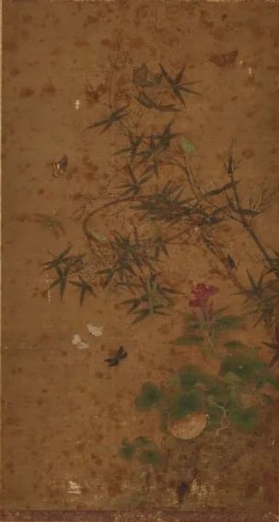 趙昌喜歡折枝花草,極富生意,著色有突出成就,在宮廷黃家富貴一體花鳥畫盛行的時候,以充滿生機、活潑鮮明的用筆表現富有野趣的自然花蟲草蝶,體現了極富個性的花鳥畫風。在這幅《竹蟲圖軸》中,作者以細膩的筆法和鮮麗的賦彩,寫實地描繪出曲竹、以及周圍的地瓜、雞冠花、蝴蝶、蜻蜓、金鐘兒、紡織娘等草蟲。一般認為草蟲圖中描繪的花草和昆蟲各有寓意。例如:瓜的寓意是子孫興旺長久,雞冠花上與蟈蟈,表示出人頭地的“官上加官”吉祥之意。本圖中雖未畫有蟈蟈,但推測是以雞冠花來表示出人頭地的寓意。