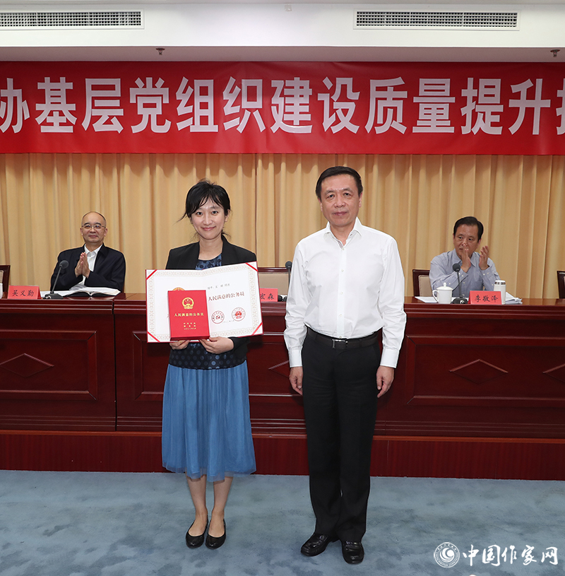 會議為獲得中央和國家機關“四強”黨支部稱號的中國作協辦公廳黨支部、作家出版社有限公司第二黨支部頒授獎牌,為獲得全國“人民滿意的公務員”的外聯部王婉同志頒授證書、獎章。中國作協辦公廳黨支部書記李一鳴、作家出版社有限公司第二黨支部書記王麗勇、魯迅文學院黨支部書記徐可、民族文學雜志社黨支部書記石一寧等4位同志作了交流發言。
