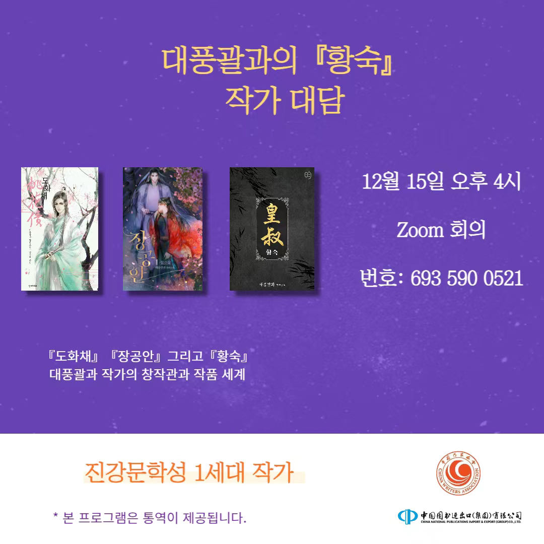2022年12月15日,在中國作家協會的指導和支持下,韓國“中國文學讀者俱樂部”與中國圖書進出口(集團)有限公司聯合舉辦了中國網絡文學作品分享會。活動邀請了古風文學創作代表作家大風刮過,韓國青年漢學家、作家金依莎,以及當地出版人和中國網絡文學愛好者在線參加。