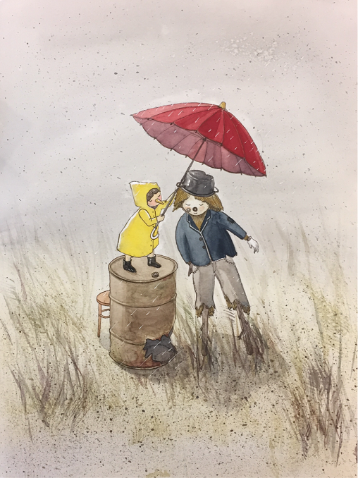 他舉著傘靜靜地站在稻草人身邊。