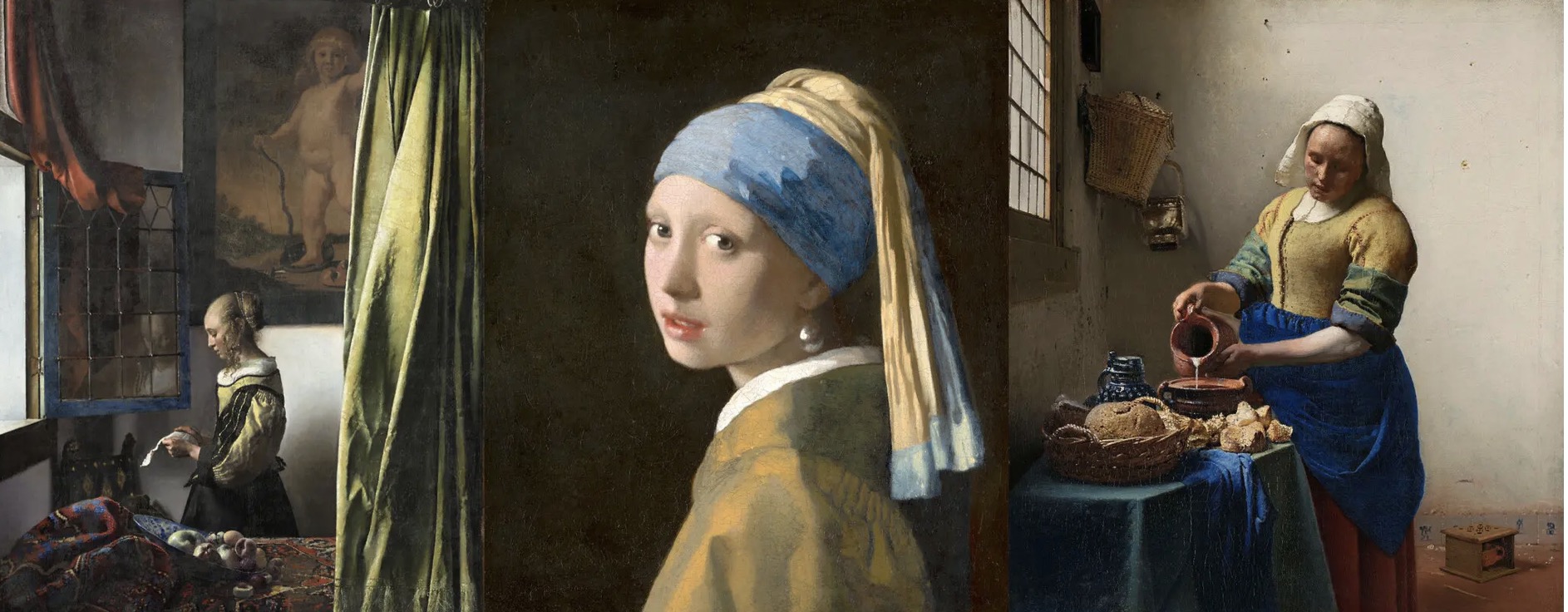 展覽作品,左至右依次為《窗邊讀信的女子》、《戴珍珠耳環的少女》和《倒牛奶的女仆》。