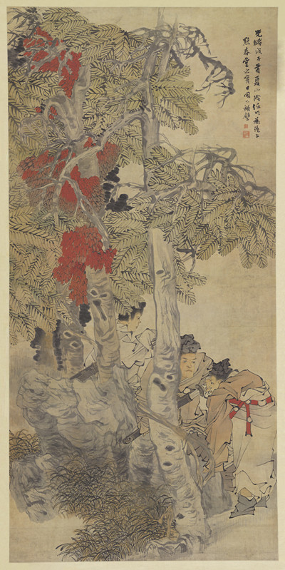 任畫多英雄氣,畫中英雄氣,千秋猶凜然,因此如何表現其“英雄氣”,是觀畫的一個關注點或重點。畫中撲入眼簾的,首先是那一樹紅色,是老樹上掛的藤蔓,紛披著紅花紅葉,燦爛照眼。而右下人物的紅腰帶與之相映,全圖生色。