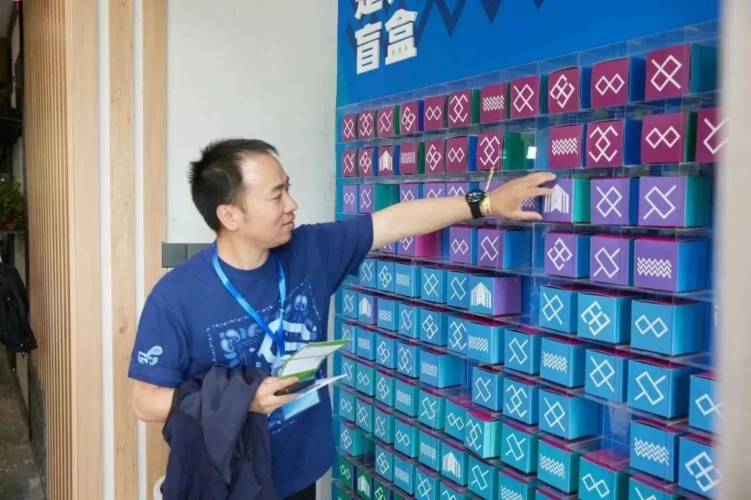 作家驛站的入口,有一整面墻都是文學盲盒,不同色系的盲盒上印有畬族傳統彩帶中的織紋圖案,有的代表“天長地久”“溝通”,有的代表“田野”“魚”“民族繁榮”等。參與者完成探營日任務可從中抽取禮物,有網絡文學名家簽名實體書以及畬鄉網絡文學村自己設計的帆布袋、胸針、書簽、手機支架等文創周邊產品。作家活動照片墻和幾個放滿網絡文學實體書的書架旁,有山花隨意點綴,頗具人文意趣,這一靜態空間讓人感受到一種被邀請了解、感受、交流的互動感。