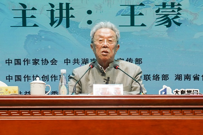 這是中國(guó)作家協(xié)會(huì)“作家活動(dòng)周”暨中國(guó)作家“益陽(yáng)文學(xué)周”開(kāi)幕后舉辦的第一場(chǎng)重磅活動(dòng)——“清溪一課”。“人民藝術(shù)家”王蒙來(lái)到益陽(yáng),為參加“作家活動(dòng)周”和“益陽(yáng)文學(xué)周”的作家朋友,以及益陽(yáng)本地的學(xué)生、市民、文學(xué)愛(ài)好者上了生動(dòng)一課。