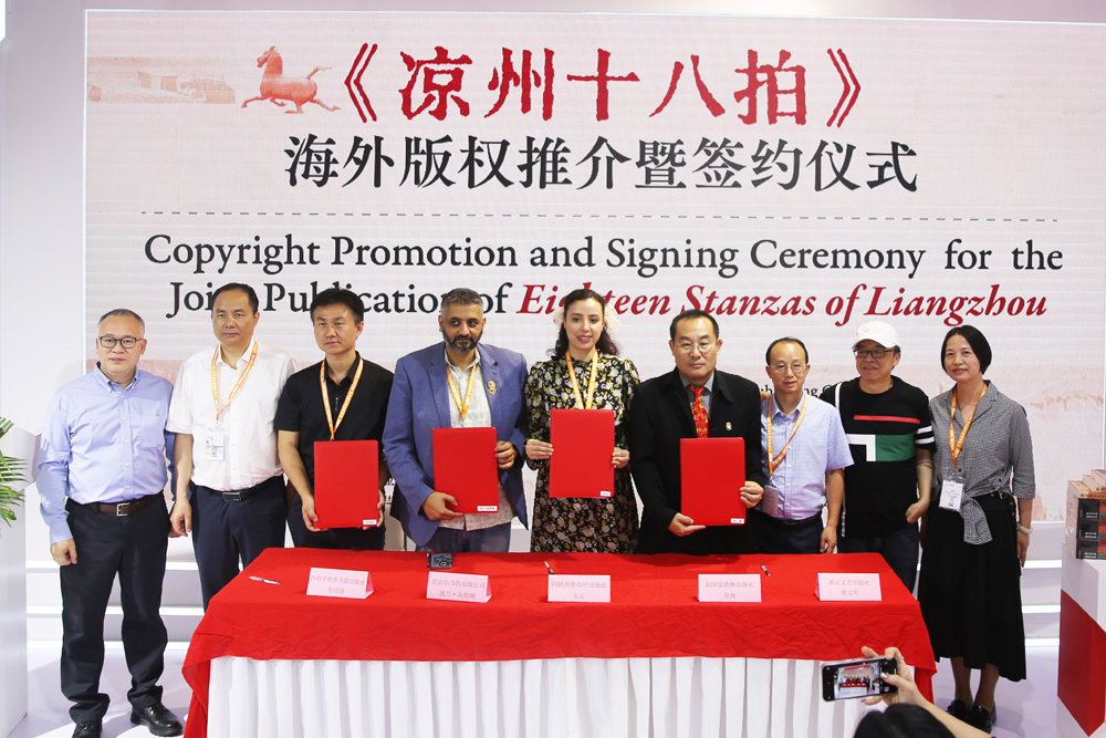 當日下午,由浙江出版聯合集團主辦、浙江文藝出版社承辦的“《涼州十八拍》海外版權推介暨簽約儀式”在第二十九屆圖博會現場舉行。簽約儀式上,作家葉舟和浙江文藝出版社跟西班牙世界書籍出版社、羅納尼亞集成出版社、阿聯酋指南針出版社、泰國曼德琳出版集團和尼泊爾當代出版公司簽訂《涼州十八拍》的西班牙語、羅馬尼亞語、阿拉伯語、泰語、尼泊爾語等語種的翻譯出版合作協議。這也成為本屆圖博會上中國文學走出去的標志性成果之一。