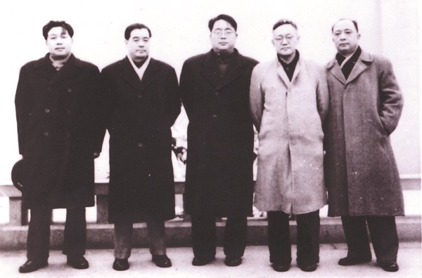從右往左:唐弢、巴金、靳以、孔羅蓀、峻青