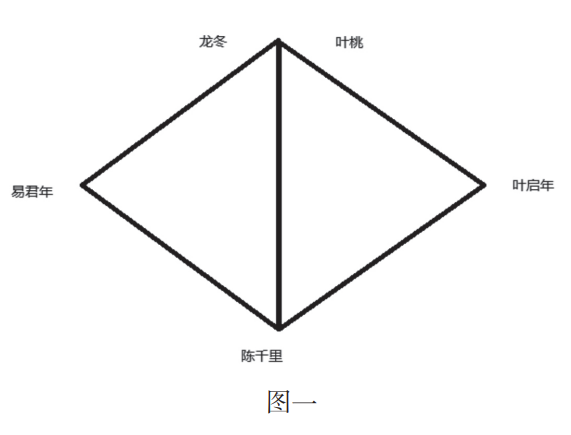可以看出,《千里江山圖》兩條主要的情節線索,恰好形成了兩組人物關系三角形,建構了極為工整的對位關系。在第一組人物關系三角形中,陳千里和易君年構成三角形的底邊和底角,而頂角則是三年前在廣州被殺害的龍冬;在第二組人物關系里,陳千里和葉啟年作為底邊和底角,則同樣指向了頂角處在南京被槍殺的葉桃。在時間的維度上,兩個三角形的結構,都是處在1933年的底邊和底角,指向了1929年的頂角。巧合的是,葉桃被殺害前正在執行的任務,恰恰是從葉啟年辦公室的保險柜里,尋找中共廣州地下組織被破壞的原因(也就是龍冬之死的真相)。這就使得兩個三角形不僅分享著共同的底角——陳千里,而且深入到歷史當中的兩個頂角也緊密地勾連在一起(見圖一)。
