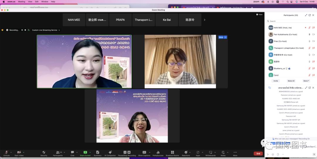 12月9日,由中國作家協會外聯部指導,中國圖書進出口(集團)有限公司聯合泰國南美書局舉辦了2023年泰國“中國文學讀者俱樂部”活動——李東華作品《焰火》泰文版首發式暨閱讀分享會。泰國陳氏金出版社社長陳美琪、編輯盧伊惠,南美語言學院、泰國達叻男子中學學校漢語組學生以及泰國漢語教師等30多人在線參加。