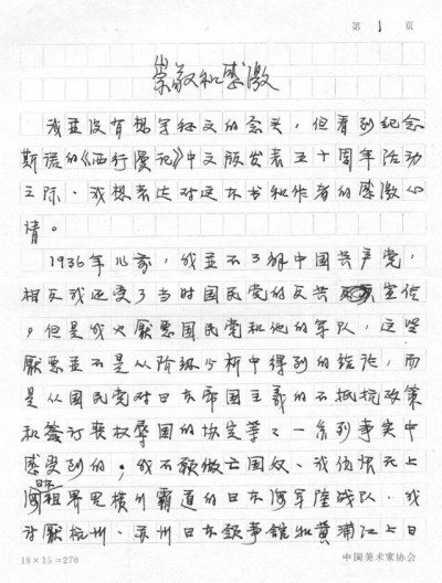 歲月荏苒,這篇由我保存了近40年的華君武“崇敬和感謝”征文稿,我準(zhǔn)備在適當(dāng)?shù)臅r候捐贈給有關(guān)博物館、紀(jì)念館,讓千千萬萬的年輕人和參觀者從這一篇征文中,了解到埃德加·斯諾《西行漫記》一書的魅力,并從漫畫大家華君武與此書結(jié)緣的故事中,了解到近百年前那個烽火連天、洪流滾滾、英勇輝煌的歲月。