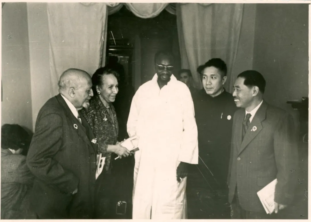 圖2 周揚、茅盾與美國作家W·E·B·杜波依斯、雪莉·格雷厄姆·杜波依斯、塞爾加爾作家,政治家馬杰蒙·迪奧普在亞非作家會議上。來源:馬薩諸塞大學阿默斯特分校圖書館特藏和大學檔案館,網址:https://credo.library.umass.edu/