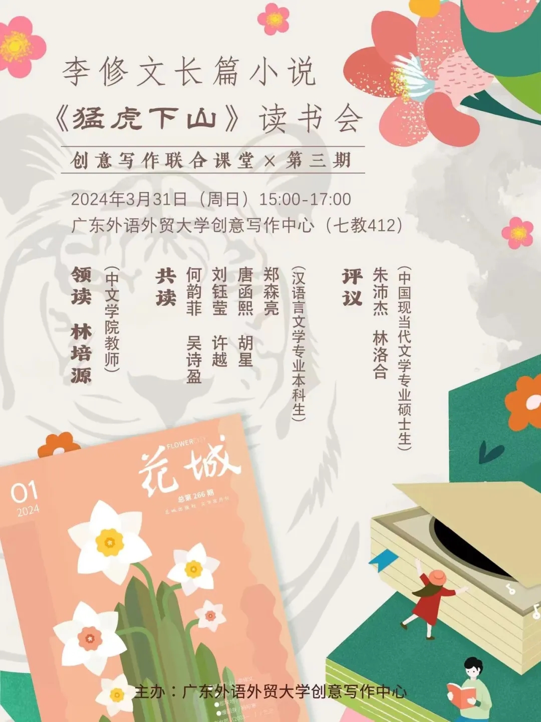 3月31日,廣東外語外貿大學中文學院本科生、碩士生,圍繞作家李修文的長篇小說《猛虎下山》,以“共讀”方式探討文學如何表現時代、書寫個人心靈、創造性轉化傳統敘事資源等話題。活動由中文學院青年教師林培源主持,中國現當代文學專業碩士生朱沛杰、林洛合擔任評議人。