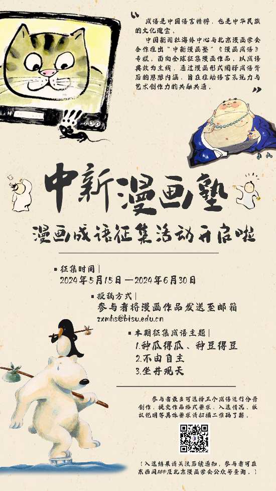 成語是中國語言精粹,也是中華民族的文化瑰寶。熟知每一個成語,不僅可以培養語言能力,也有助于加深對傳統文化的理解。即日起,中國新聞社海外中心與北京漫畫學會合作推出“中新漫畫塾”《漫畫成語》專欄,現面向全球征集漫畫作品。