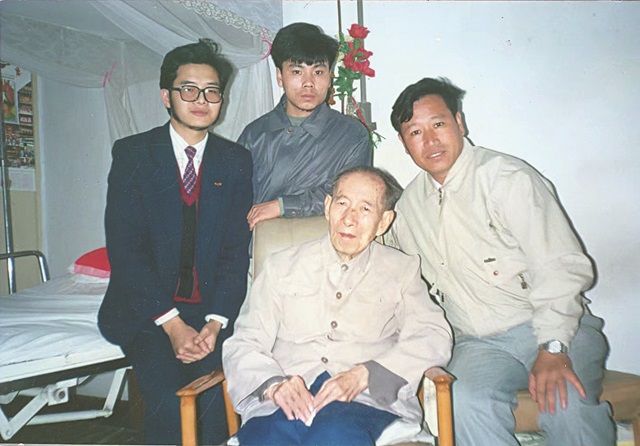 1992年5月19日,湯繼強(左一)陪同《演講與口才》雜志社副社長殷銘(右一)去省人民醫院看望艾蕪(中坐)
