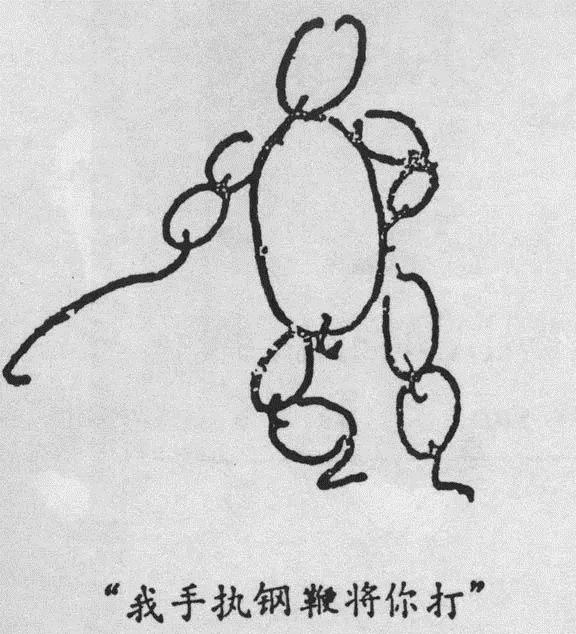 1933年2月上旬,瞿秋白第二次來(lái)到魯迅家中避難。瞿秋白對(duì)魯迅的著作素有研究,他撰寫1.7萬(wàn)字的《〈魯迅雜感集〉序言》,是研究魯迅的重要文獻(xiàn)。瞿秋白對(duì)魯迅的代表作《阿Q正傳》,也有深刻的見解。這次避難中,瞿秋白繪制了兩幅關(guān)于阿Q的漫畫。其中,《我手執(zhí)鋼鞭將你打》,堪稱既抽象又寫意“阿Q漫畫”,整個(gè)人物由10個(gè)大寫的英文字母Q,巧妙構(gòu)成,包括頭、身體各一個(gè),四肢各兩個(gè),共10個(gè),構(gòu)思獨(dú)出機(jī)杼,造型夸張傳神,令人莞爾。畫面左邊,前臂上的一個(gè)Q字,其一撇特別長(zhǎng),略有彎曲,形似鋼鞭,非常契合小說(shuō)中阿Q的唱詞:“我手執(zhí)鋼鞭將你打……”又可看作主人公阿Q臨終簽字畫押的那個(gè)沒(méi)有畫圓的“圈兒”。整幅漫畫線條簡(jiǎn)潔,想象奇特,妙趣橫生。