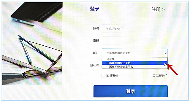 圖三(特別提醒:登錄頁新增的“前往”選項中,原創平臺用戶一定要點選下拉菜單中“中國作家網原創平臺”,才能正常登錄對應平臺,注意切勿誤選“中國作家協會會員平臺”)